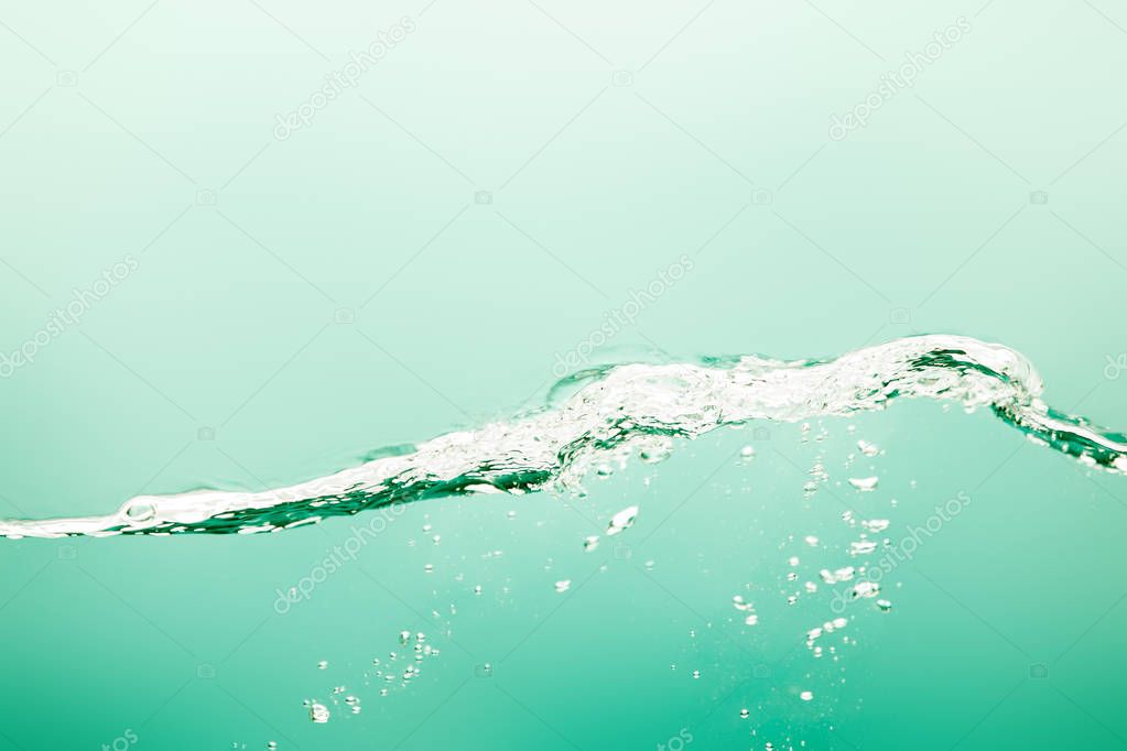 Transparent pure water with splash and bubbles on green background