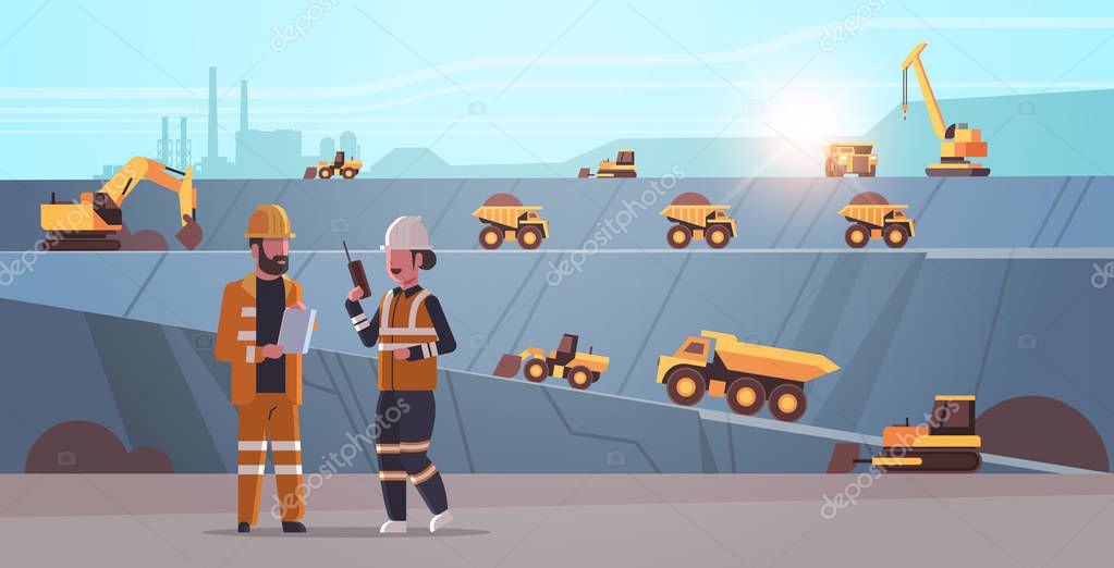 Engineers using radio and tablet workers controlling professional equipment working on coal mine extraction industry mining transport concept opencast stone quarry background flat horizontal vector