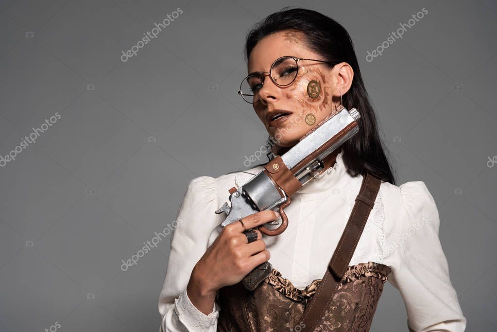 - pensive attractive steampunk woman holding vintage pistol isolated on grey