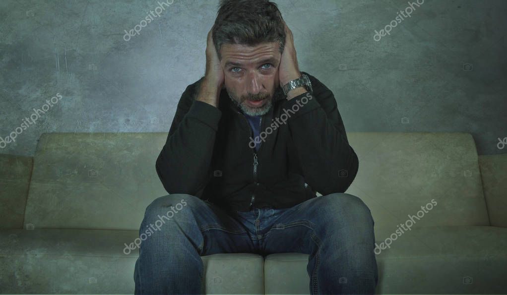 young attractive depressed and sad shady man at home couch feeling lost in pain and despair suffering anxiety crisis and depression problem on edgy grunge style