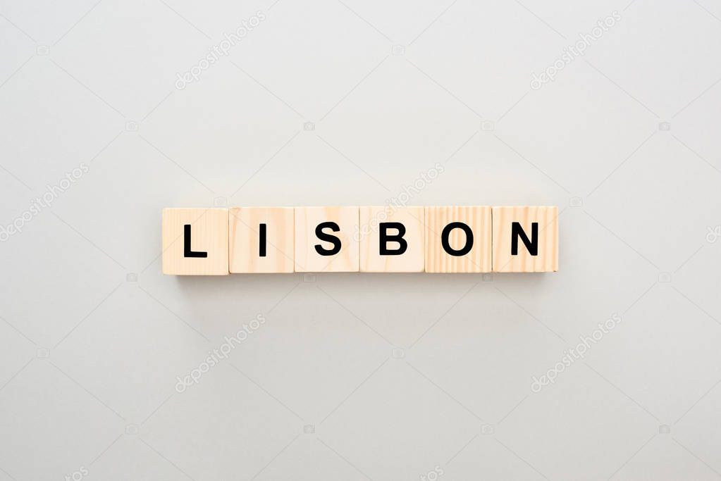 top view of wooden blocks with Lisbon lettering on grey background