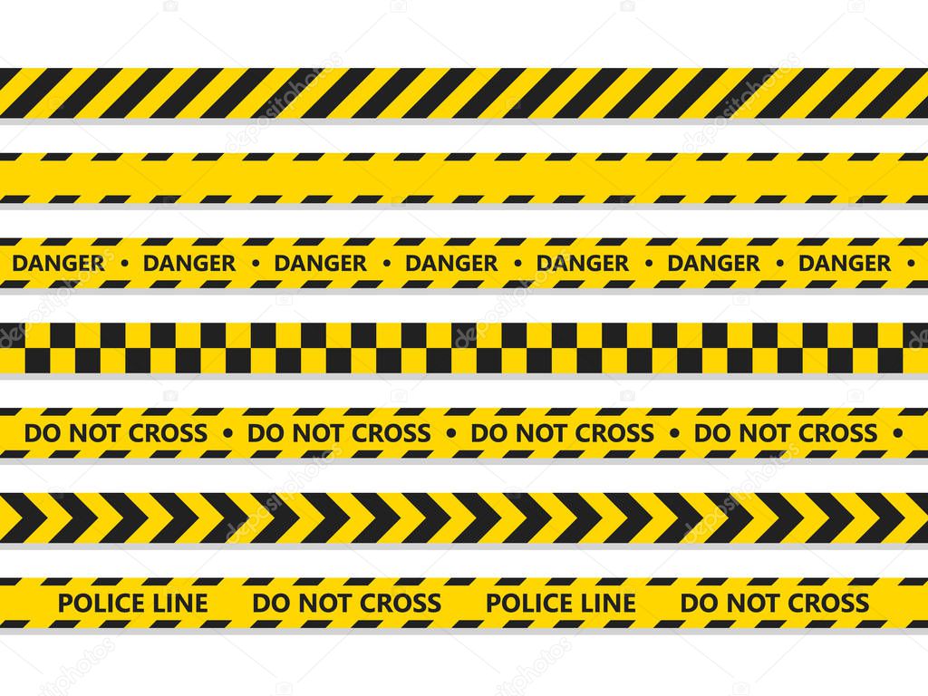 - Crime line tape. Police danger caution vector yellow barrier. Not cross security line