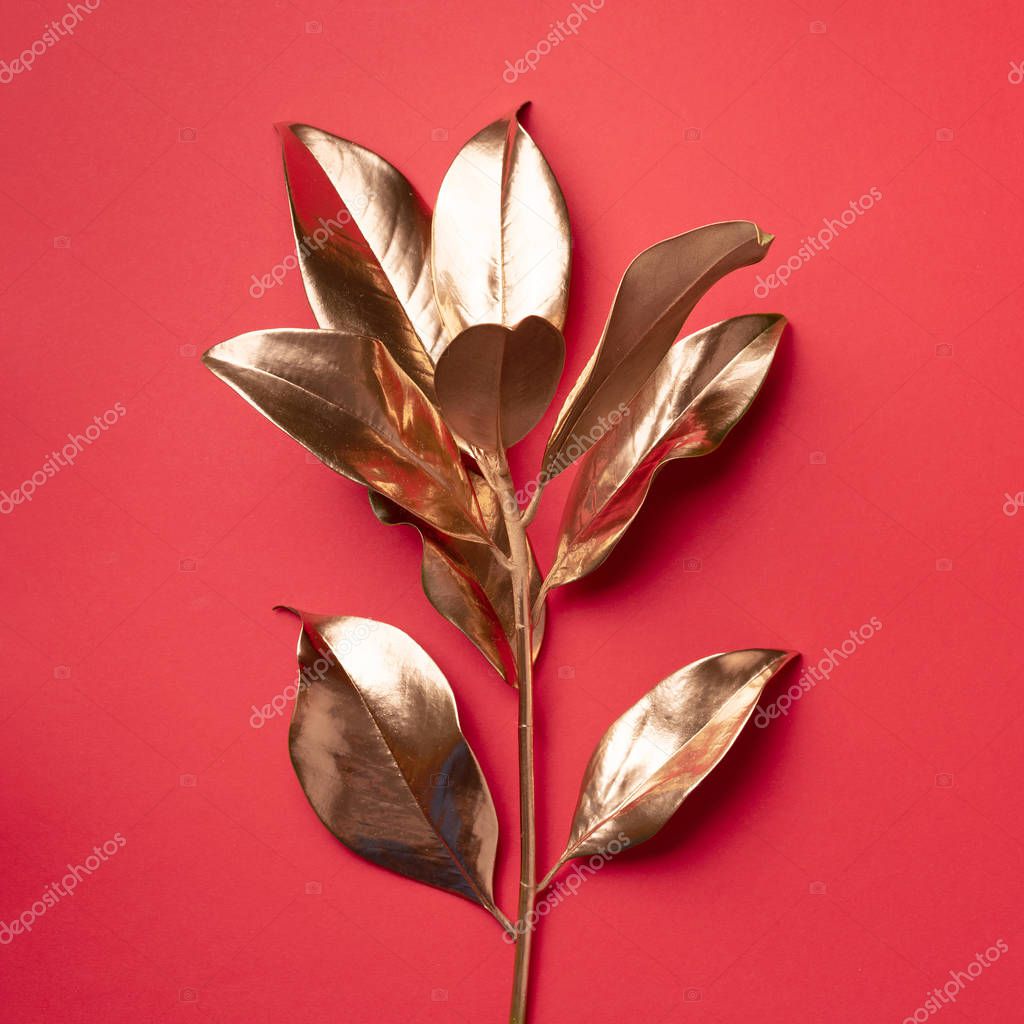 - Floral minimal style concept. Exotic summer trend. Golden tropical leaves and branch on red color background. Shiny and sparkle design, fashion concept.