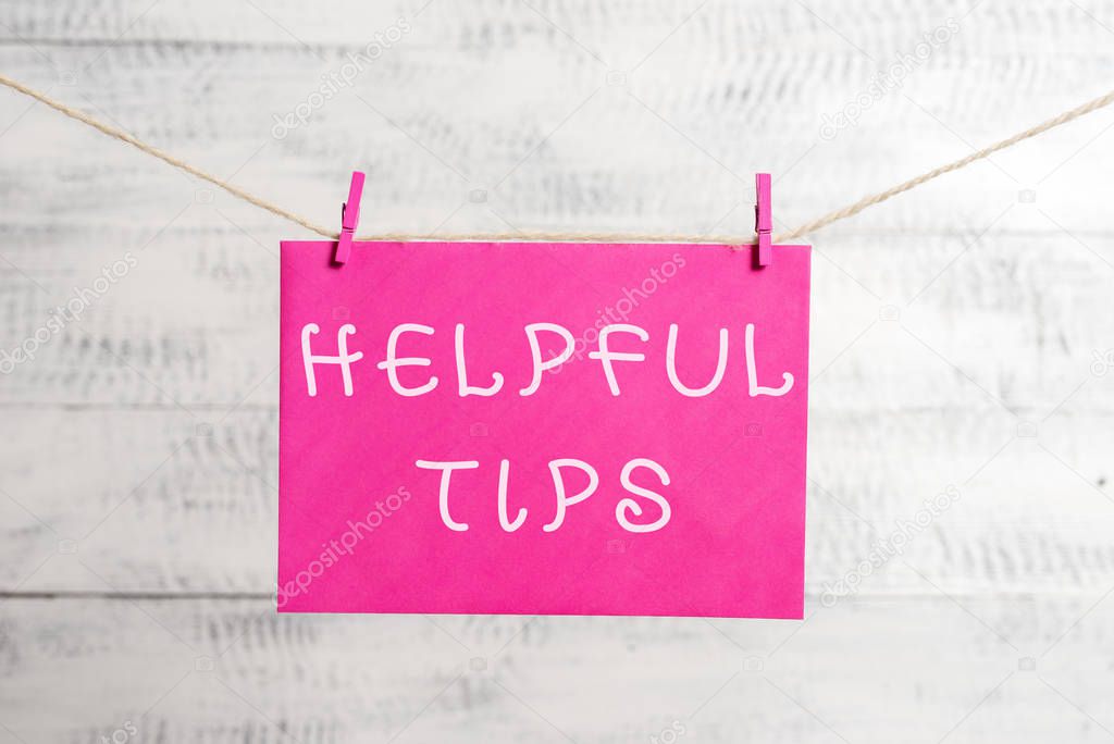 - Word writing text Helpful Tips. Business concept for advices given to be helpful knowledge in life Clothesline clothespin rectangle shaped paper reminder white wood desk.