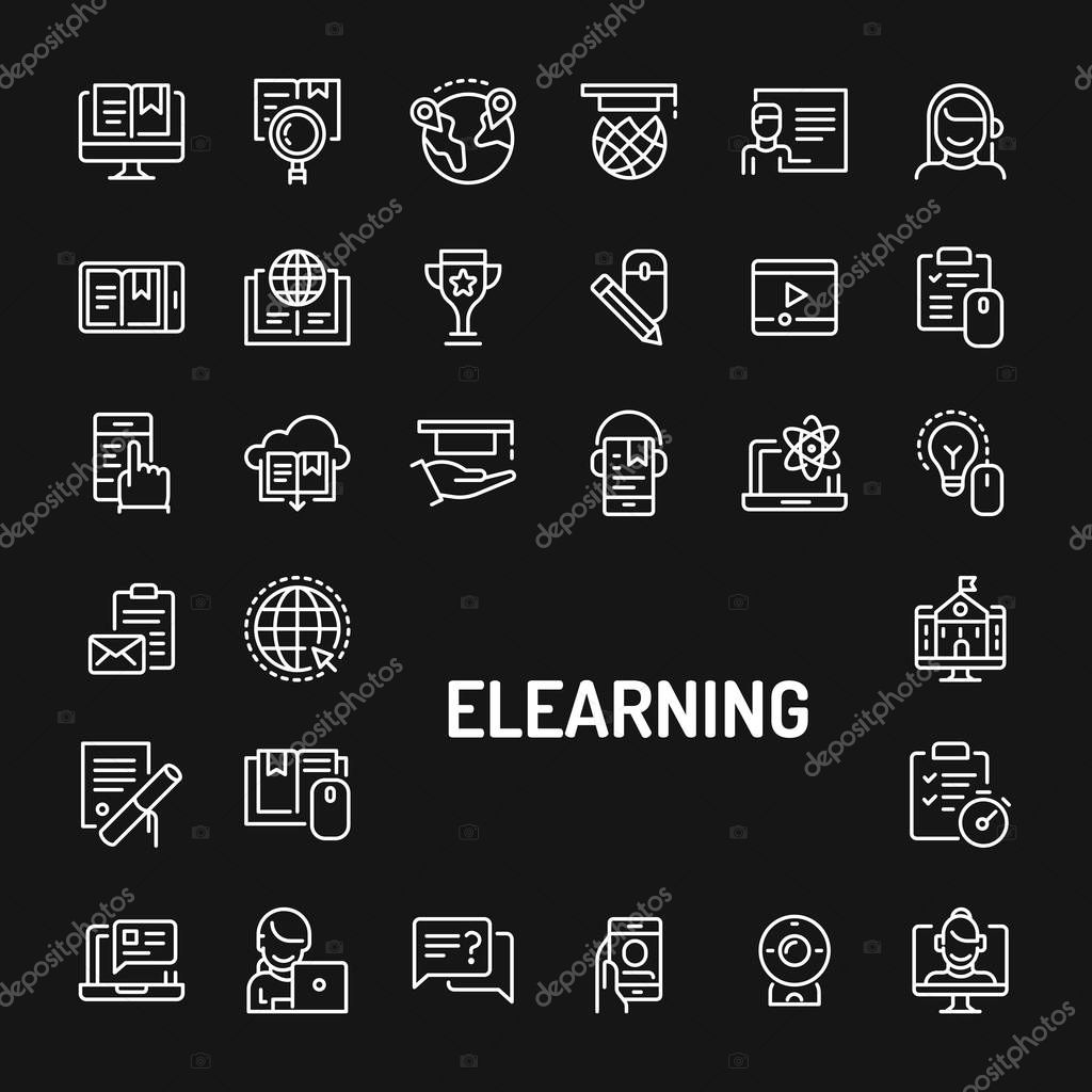 Simple white line icons isolated over black background related to Electronic media learning & online training. Vector signs and symbols collections for website and design template.