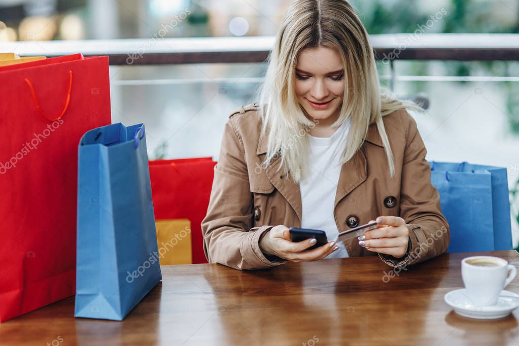 - The girl spent a lot of money. Blonde woman in brown cloak with shopping bags in cafe at shopping mall. Lady buying online with a credit card and smartphone. Coffee cup on table