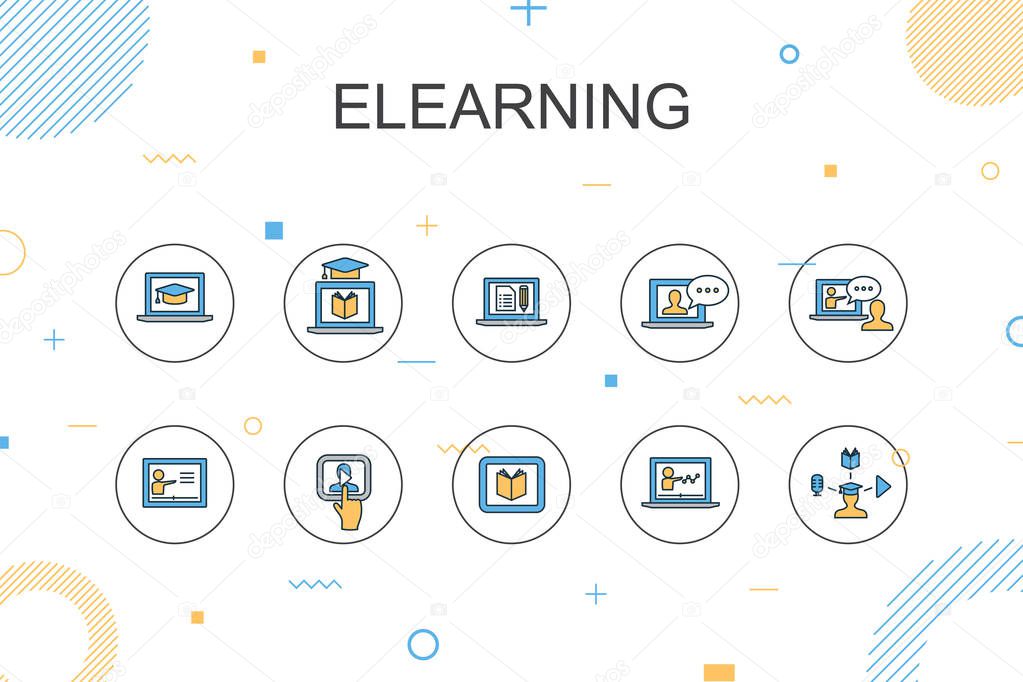 eLearning trendy Infographic template. Thin line design with Distance Learning, Online Training, Video training, Webinar