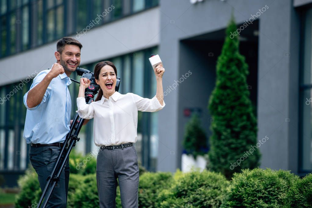 attractive journalist holding microphone and cameraman holding digital video camera