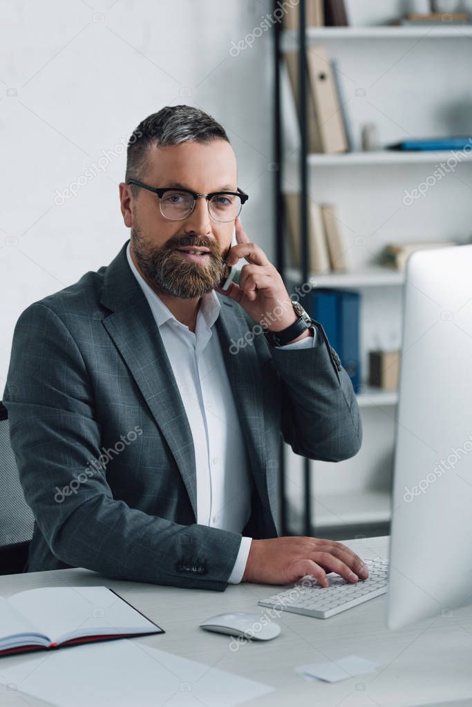- handsome businessman in formal wear talking on smartphone and looking at camera