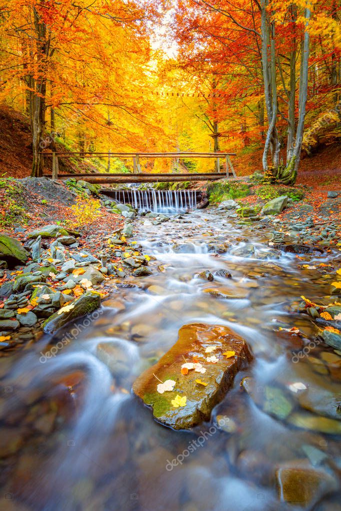 - Autumn landscape - Old wooden bridge fnd river waterfall in colo