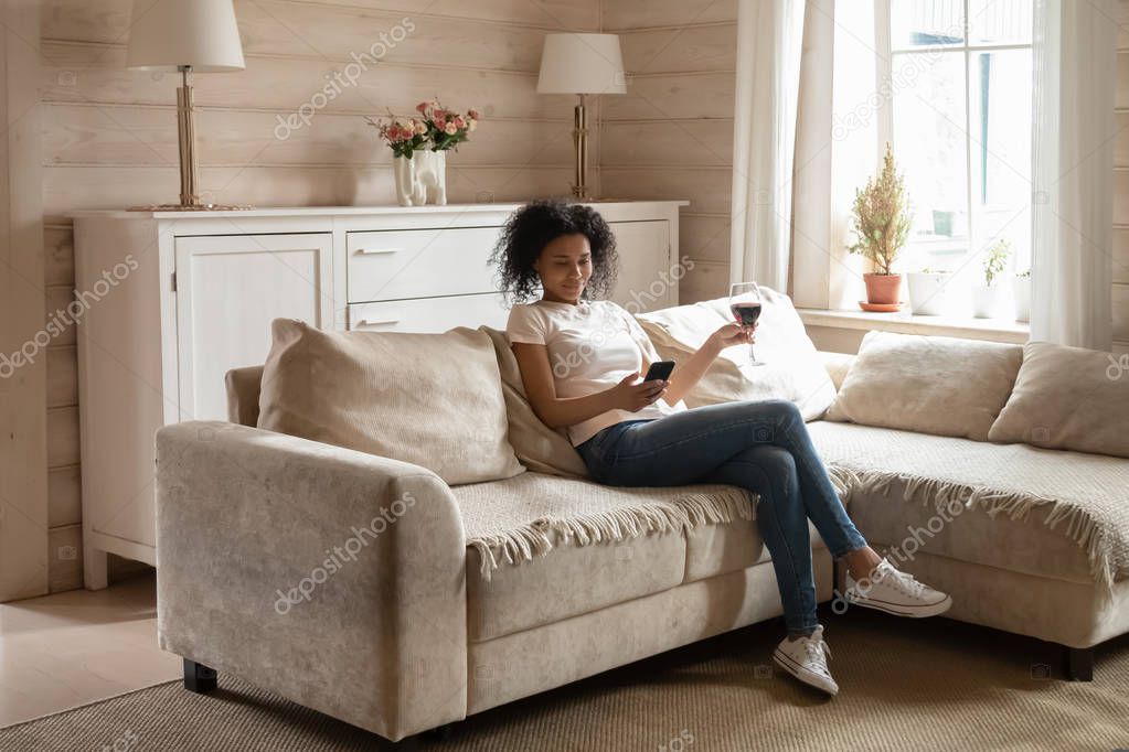 Happy african American young woman sit relax on comfortable sofa drink wine using cellphone in living room, calm biracial female rest on cozy couch at home browsing internet, enjoy weekend