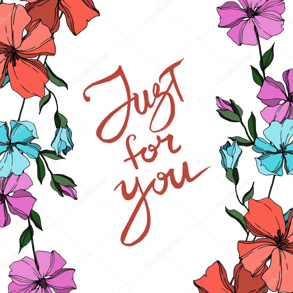 Vector Flax floral botanical flowers. Black and white engraved ink art. Frame border ornament square.