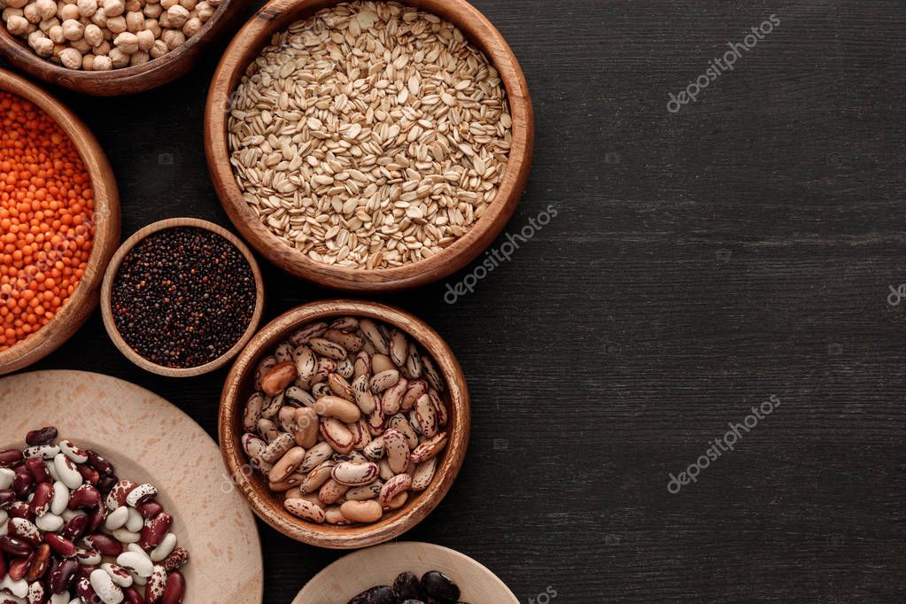 top view of brown bowls with raw beans, lentil, oatmeals and quinoa on dark wooden surface with copy space