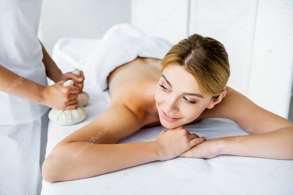 Cropped view of masseur doing back massage with herbal balls to smiling woman in spa