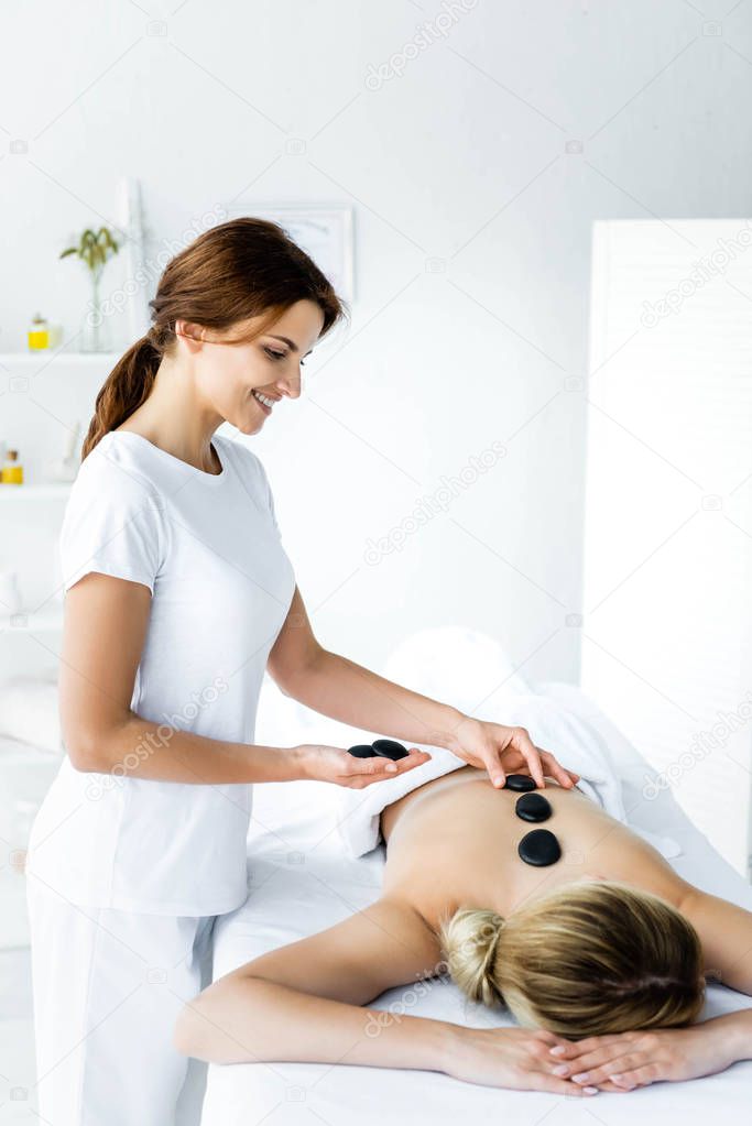 attractive and smiling masseur doing hot stone massage to woman in spa
