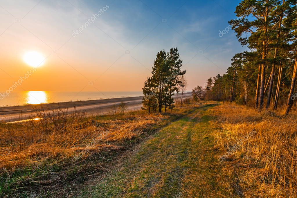 Spring landscape. Sunset over the Ob sea. Novosibirsk region, Western Siberia, Russia