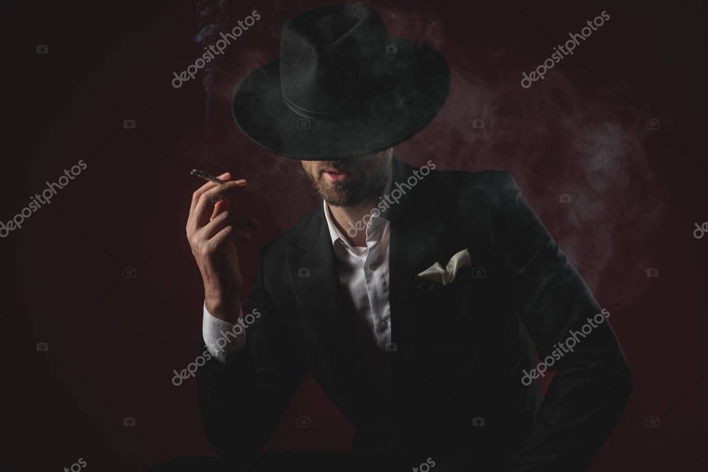Attractive young man wearing tuxedo and black hat, looking down, smoking cigarette and sitting on black background