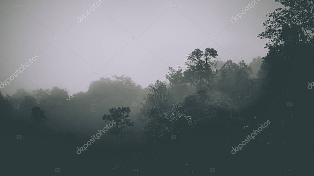 - Misty landscape with fir forest in hipster vintage retro style. Fairy tale spooky looking woods in a misty day. Cold foggy morning in horror forest