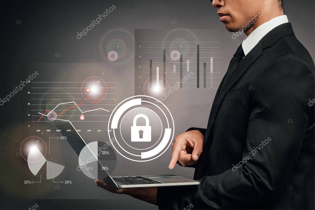 - partial view of african american businessman using laptop on dark background with internet security illustration