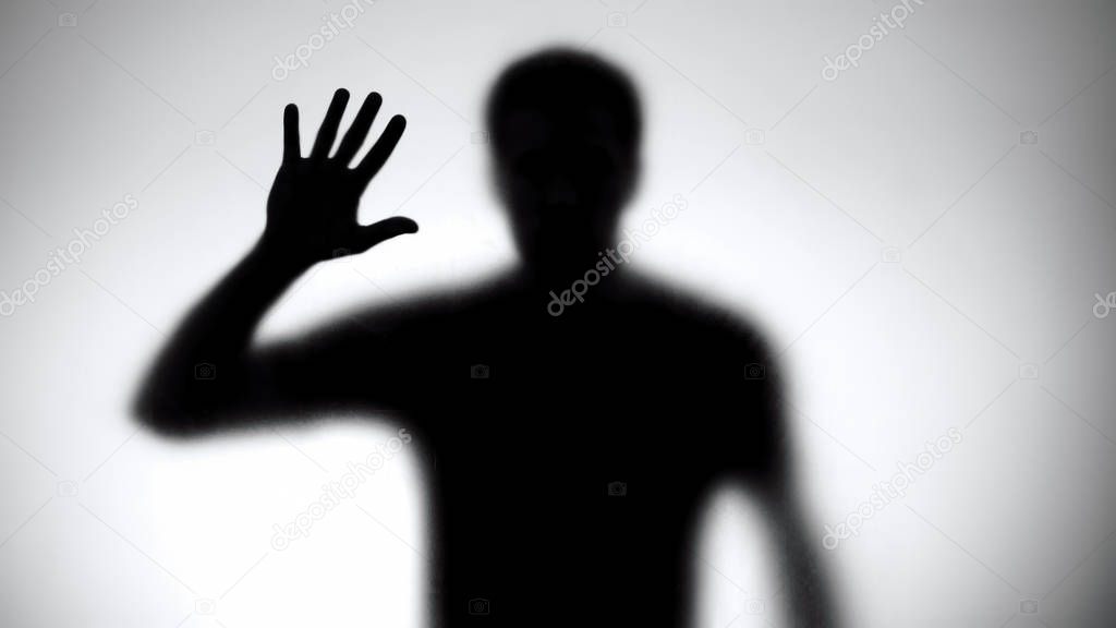 Man silhouette touching glass wall, searching way out, trapped victim, danger