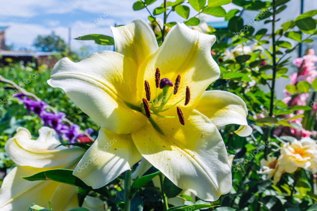 Blooming white lily on a bright summer background. Falling pollen from the stamens, a strong-smelling flower, macro