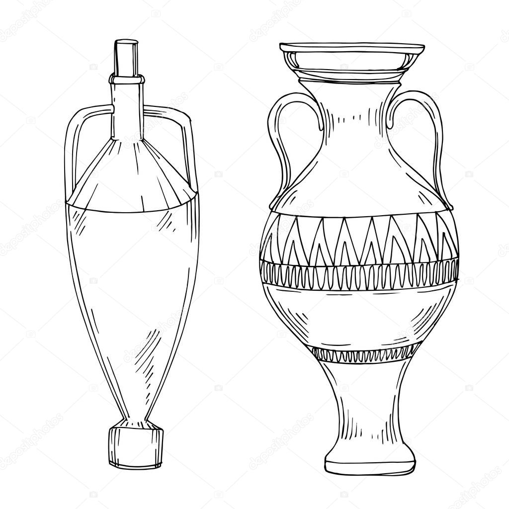 Vector Antique greek amphoras. Black and white engraved ink art. Isolated ancient illustration element.