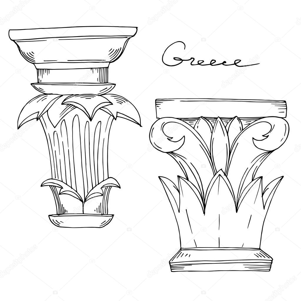 Vector Antique greek columns. Black and white engraved ink art. Isolated ancient illustration element.
