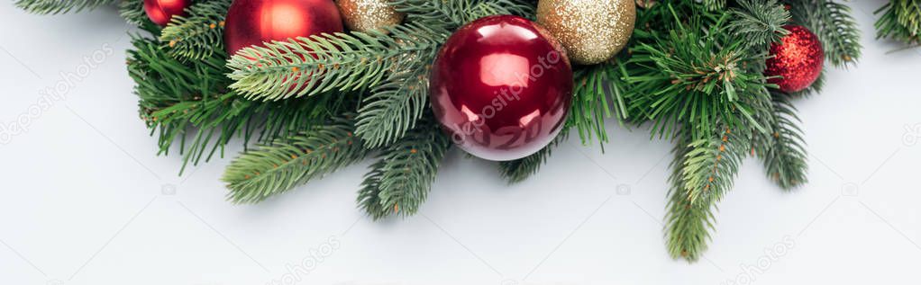 Top view of Christmas tree wreath with baubles on white background, panoramic shot