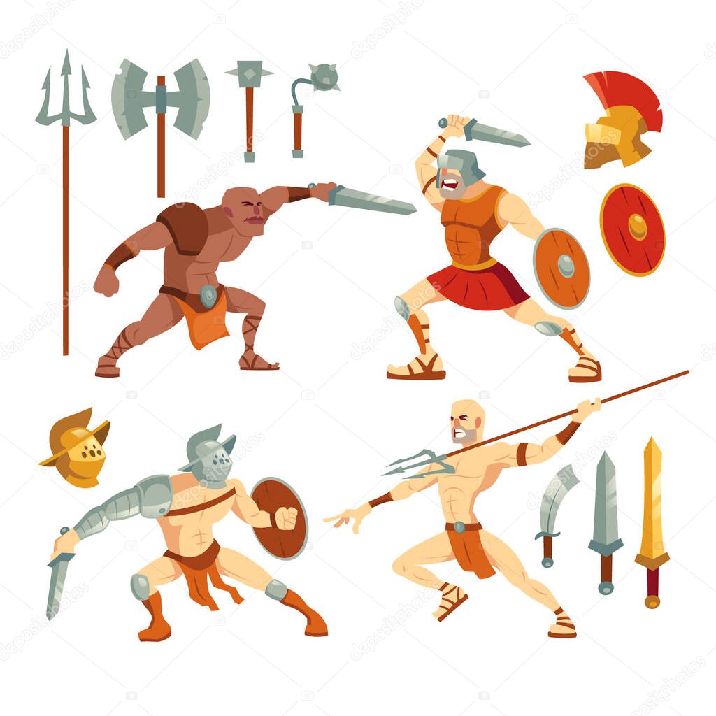 Gladiators set, ancient roman armored spartan warriors fighting on arena with sword, pitchfork and shield, greek soldiers and armor collection isolated on white background, Cartoon vector illustration