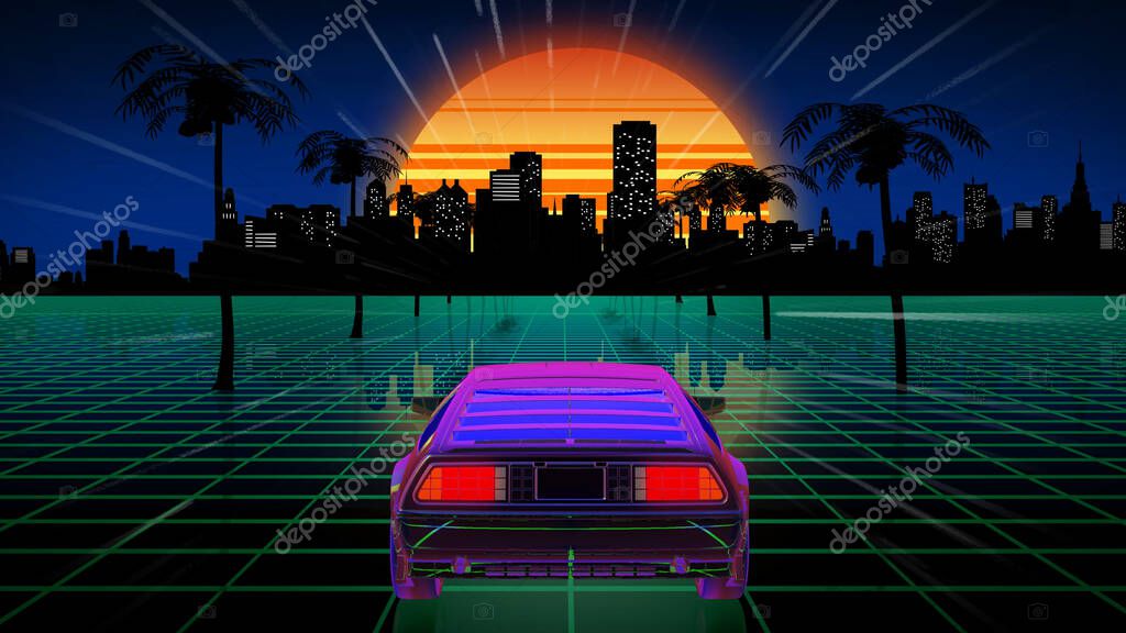 Bright retro futuristic world of computer space in the style of science fiction of the 80s. Futuristic car in virtual space. The background is perfect for any thematic presentation or your own graphic project