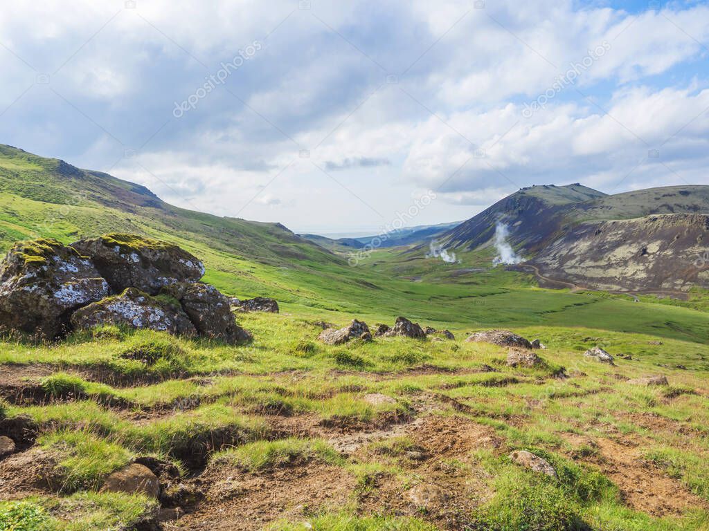 - Reykjadalur valley with hot springs river, lush green grass meadow, rocks and hills with geothermal steam. South Iceland near Hveragerdi city. Summer sunny morning, blue sky.