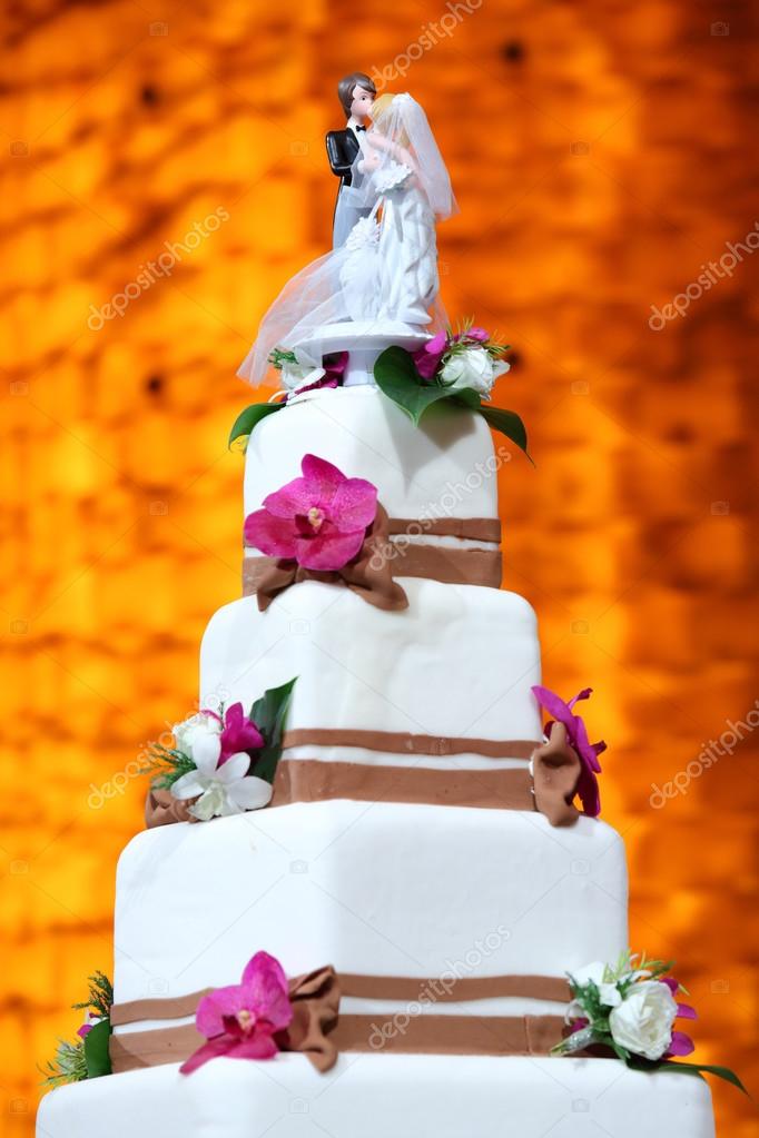 Elegance white wedding cake decorated with flower and groom and bride dolls on top