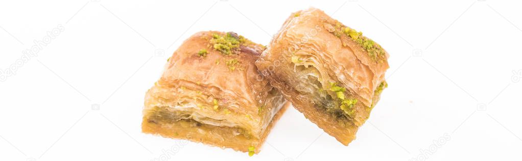 traditional turkish honey baklava with nuts isolated on white, panoramic shot