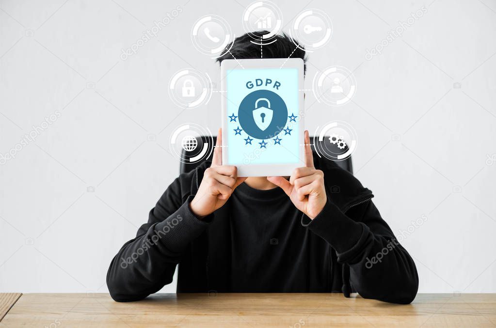 - hacker sitting at table and holding digital tablet with gdpr illustration