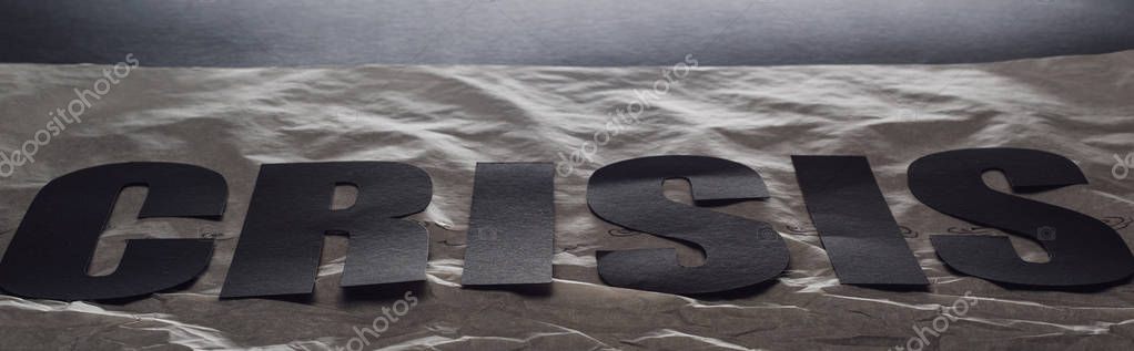 - panoramic shot of black word crisis on paper symbolizing water on black background with lighting