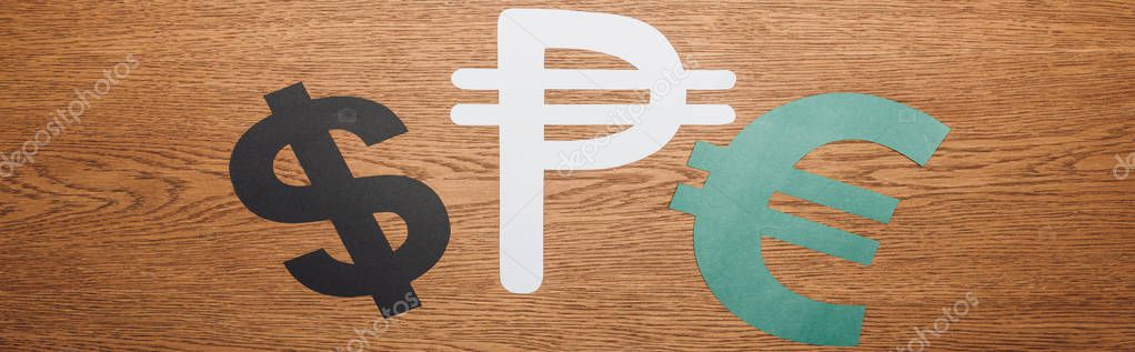 top view of dollar, peso and euro paper cut symbol on wooden desk, panoramic shot