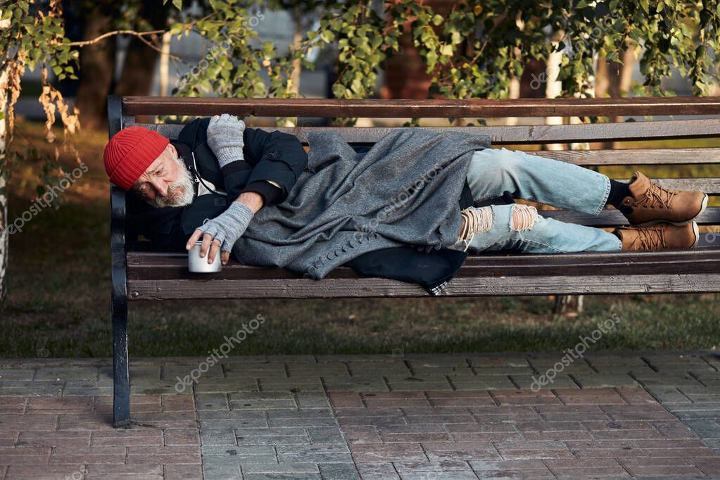 - Poor homeless man lying on bench in cold weather