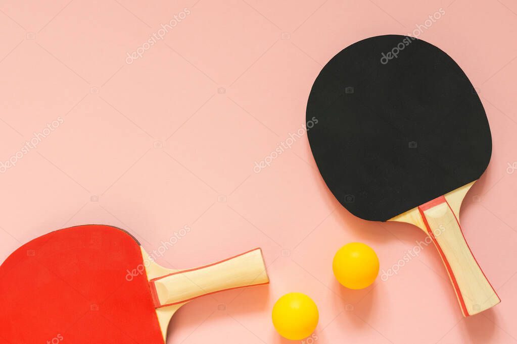 Black and red tennis ping pong rackets and orange balls isolated on a pink background, sport equipment for table tennis