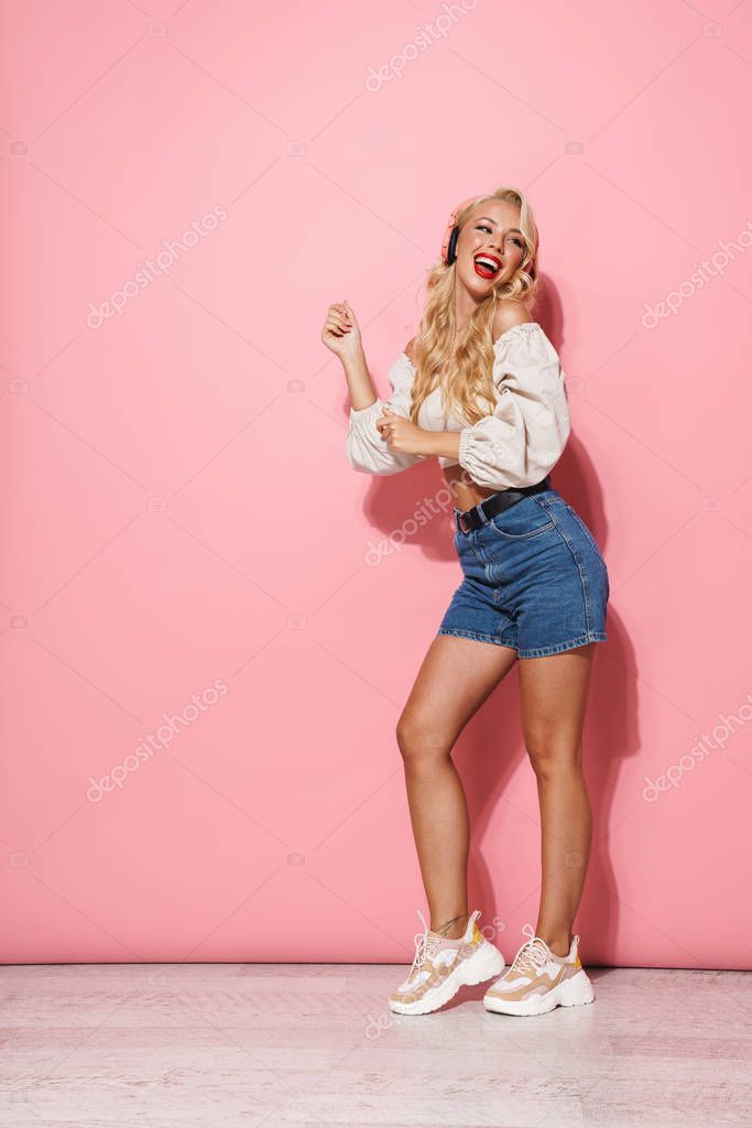 Image of a cheerful optimistic pleased young pretty blonde woman listening music with headphones posing isolated over pink wall background.