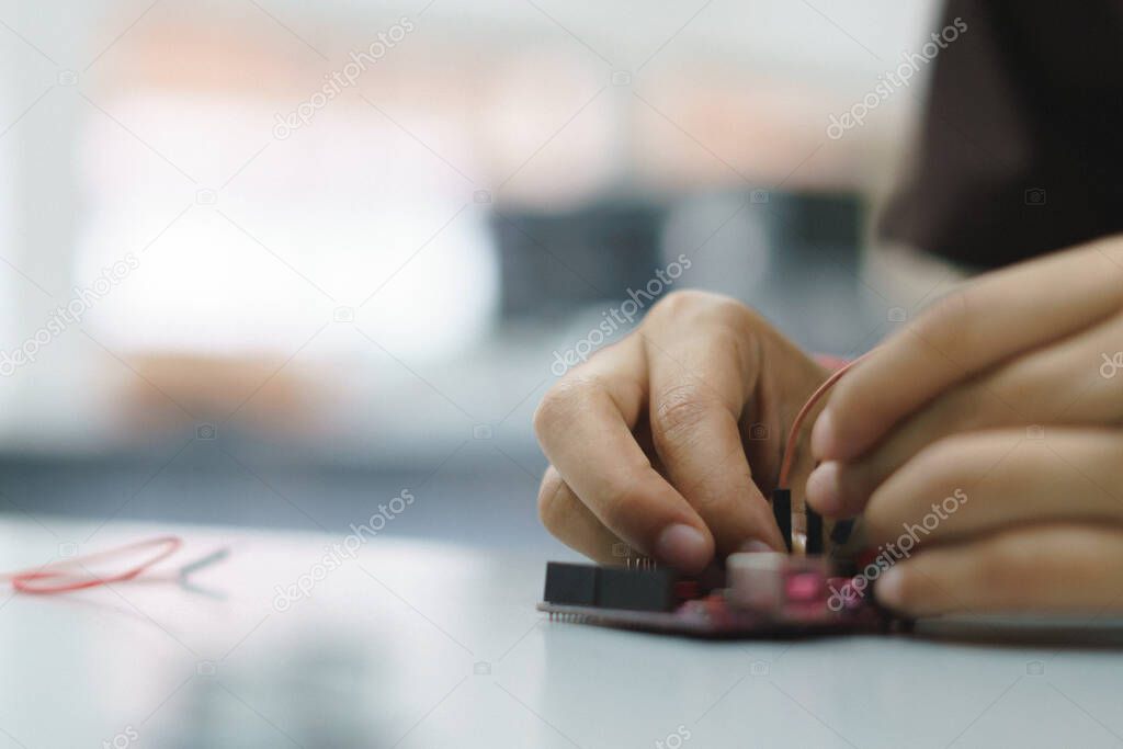 Students in Asian workshop uniform using iot development kit for educational science experiment