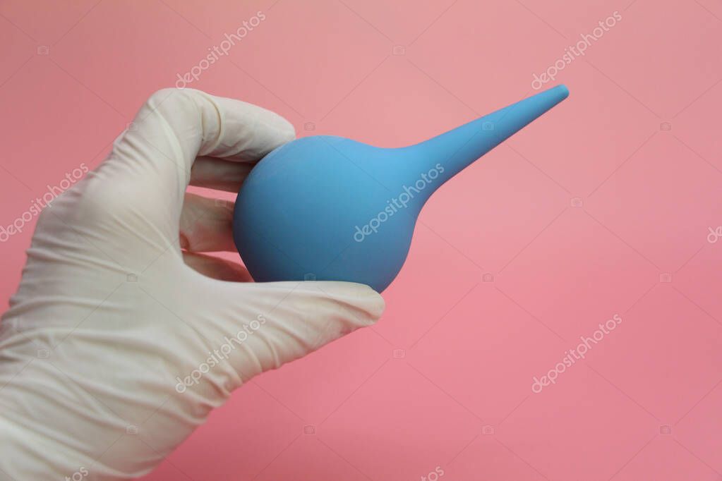 Blue syringe with a soft tip in the female hand of a doctor. A hand in a latex glove holds an enema. The medical enema is blue. The concept of treatment of chronic prostatitis.