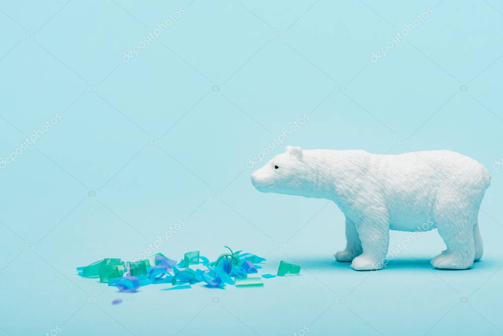 - Toy polar bear beside plastic pieces on blue background, animal welfare concept