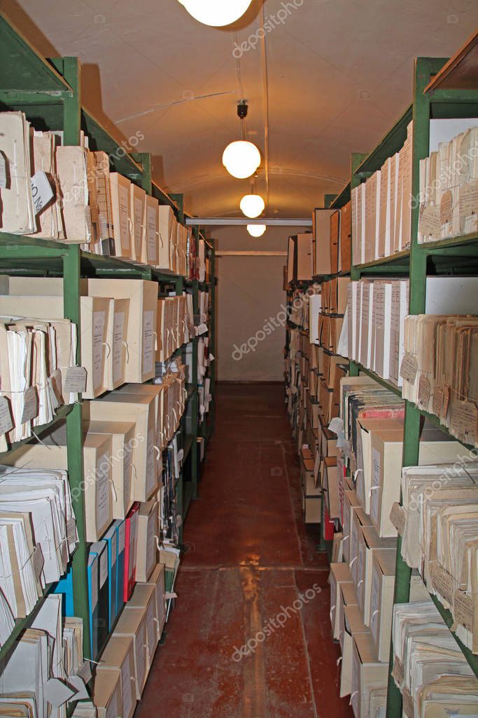 - Eniseysk, Russia, 08/23/2012, Illustrative editorial Old archive storage with documents on shelves, vintage, history.
