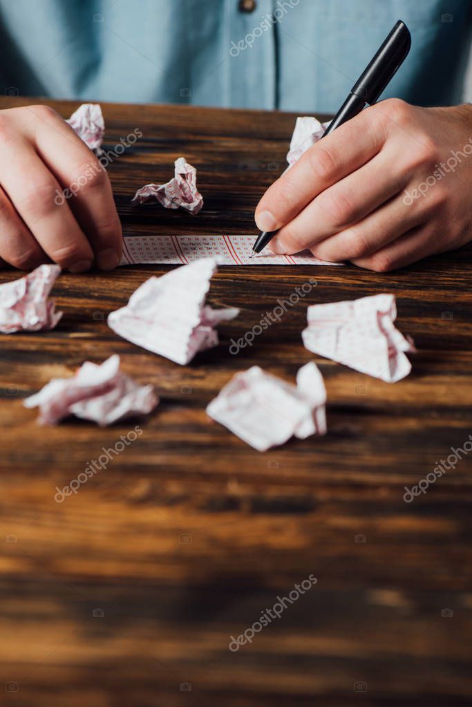 - cropped view of gambler marking numbers in lottery ticket near crumpled lottery cards on wooden table