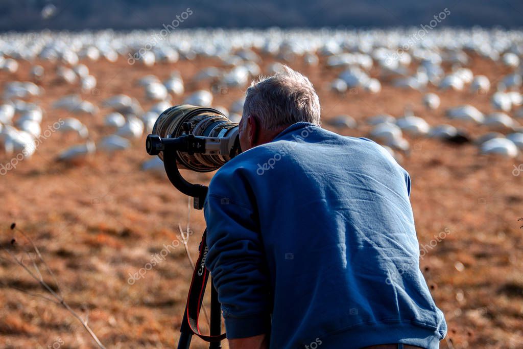 Kleinfeltersville, PA / USA - March 8, 2016: A photographer takes pictures of migrating snow geese at the Middle Creek Wildlife Management Area, located at the Lebanon and Lancaster County border in Pennsylvania.
