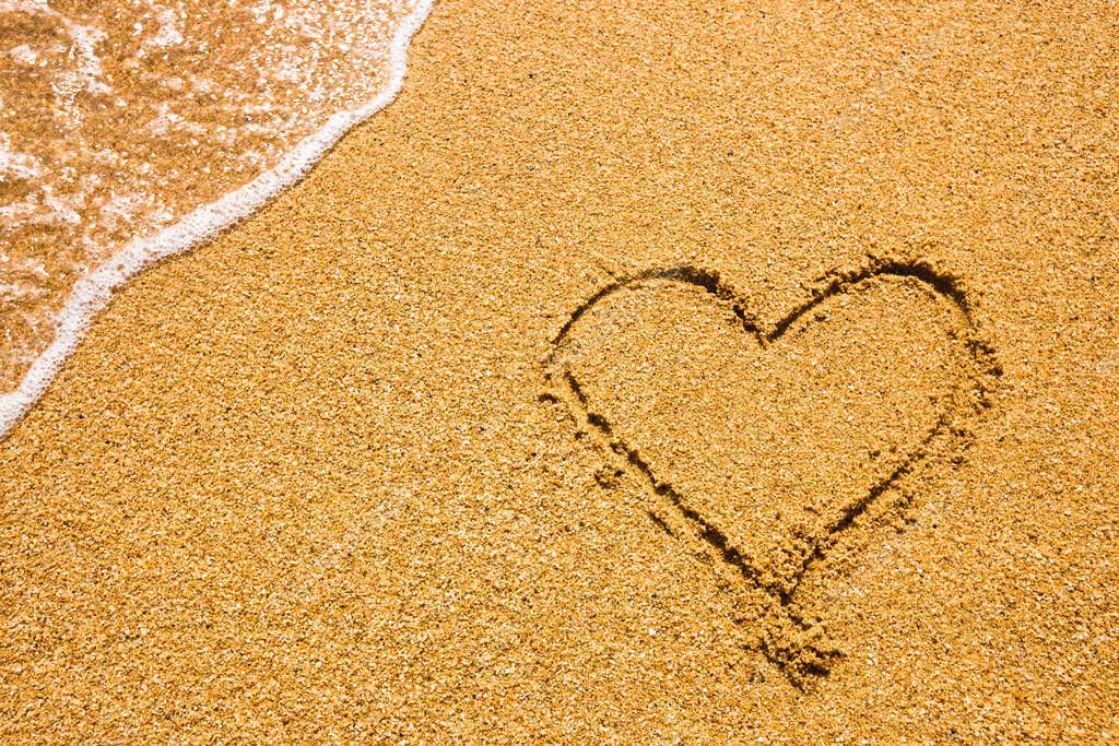 Heart symbol on the sand. Summer holiday concept. Romantic love background. Valentin Day theme. Top view. Heart drawn in sea beach sand, soft wave in a sunny day.