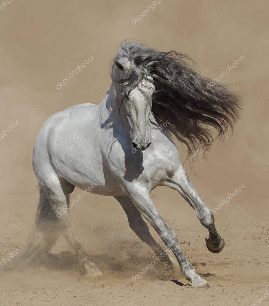 - Light gray Purebred Spanish horse playing on sand.