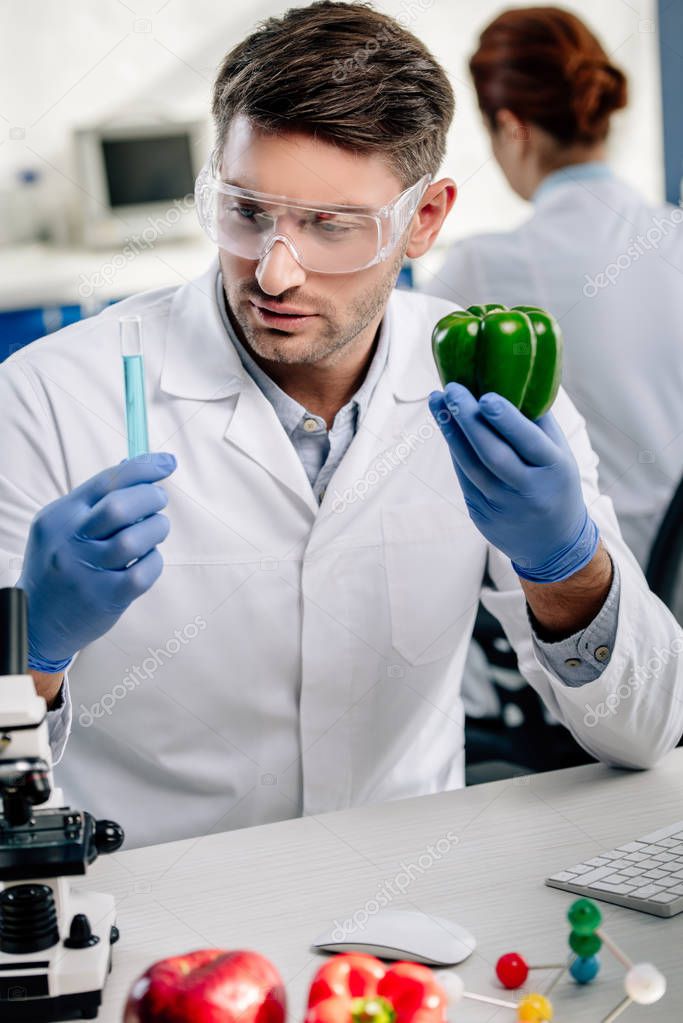 Molecular nutritionist holding bell pepper and test tube in lab