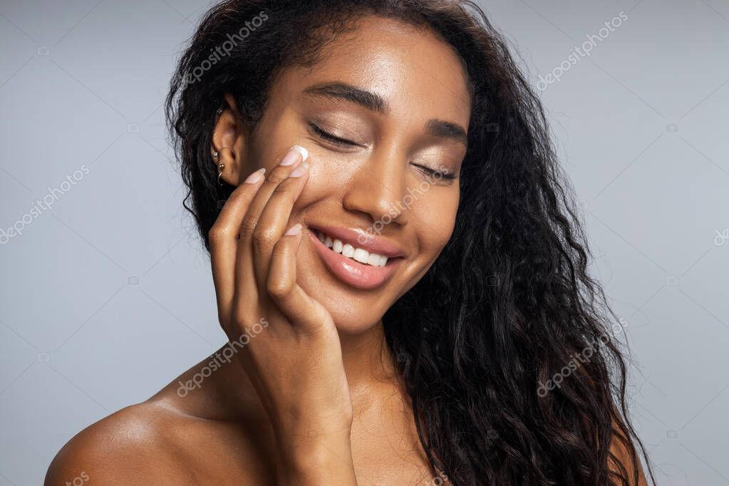 Pretty Afro woman is applying facial cream