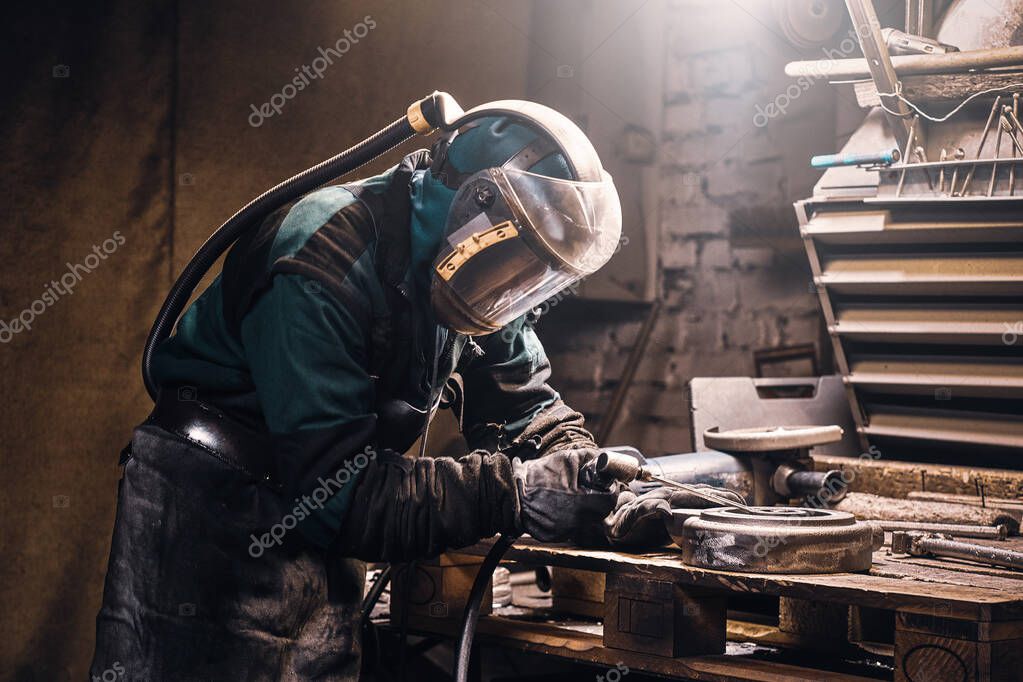 Diligent worker in protective mask making welding while working at his workplace.